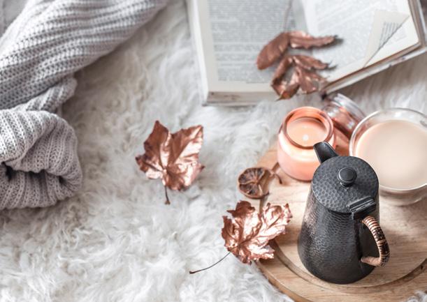 Autumn’s cosy atmosphere is enhanced by warm, ambient lighting. Replace cool-toned bulbs with warm white or soft amber lights to set a relaxing mood. Add table lamps with textured, neutral lampshades or use pendant lighting with copper or bronze finishes to complement the seasonal colour palette.