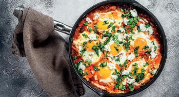 Make 4-8 hollows in the sauce and break an eggs gently into each one. Season lightly, and turn the heat down as low as possible, cover the pan with the lid and cook for about 10 minutes until the eggs are just set. Sprinkle with coriander and serve with crusty bread.