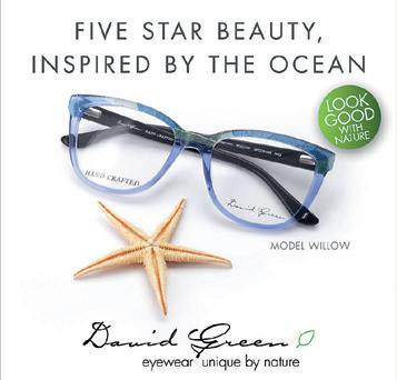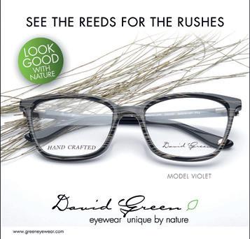 In line with the Commonwealth and environmental responsibility, Eyetech are pleased to stock David Green frames. The company’s founder, David Green is a South African entrepreneur who developed his own range with the environment in mind. The frames are crafted using cellulosebased acetate and natural vegetable dyes for colour. Fig leaves and reeds are foraged in the countryside near the factory, as well as mother of pearl found along the nearby seashore and cork used from sustainable sources. Metal components are certified to contain no harmful substances. All accessories (cloths, cases, frames) can be recycled.