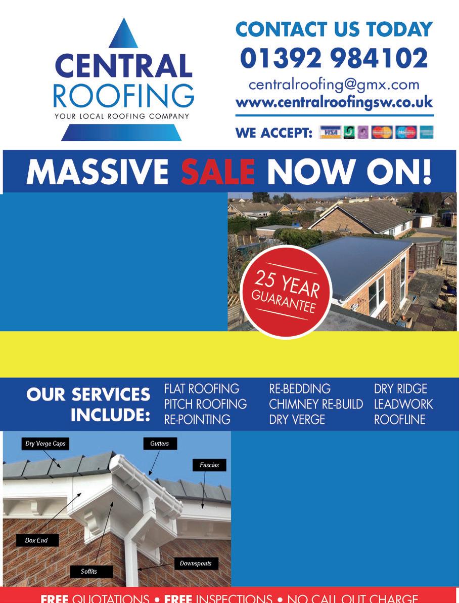 2 | www.localreach.co.uk Central Partnership Ltd, The Exchange, Express Park, Bridgwater. TA64RR 01934 265358 HIGHEST RATED ROOFER IN SOMERSET! (32 ★★★★★ Google reviews) DOWNSPOUTS DRY VERGE CAPS GUTTERS FASCIAS BOX END SOFFITS Central Partnership Ltd, The Exchange, Express Park, Bridgwater. TA64RR OUR SERVICES INCLUDE: CHIMNEY REPAIRS DRONE INSPECTIONS PITCH ROOFING FLAT ROOFING CONSERVATORY & GARAGE ROOFING FIBRE GLASS FLAT ROOFS UPVC FASCIAS ASBESTOS REMOVAL GRP • FIBRE GLASS • FLAT ROOFING centralroofing@gmx.com www.centralroofing-sw.co.uk