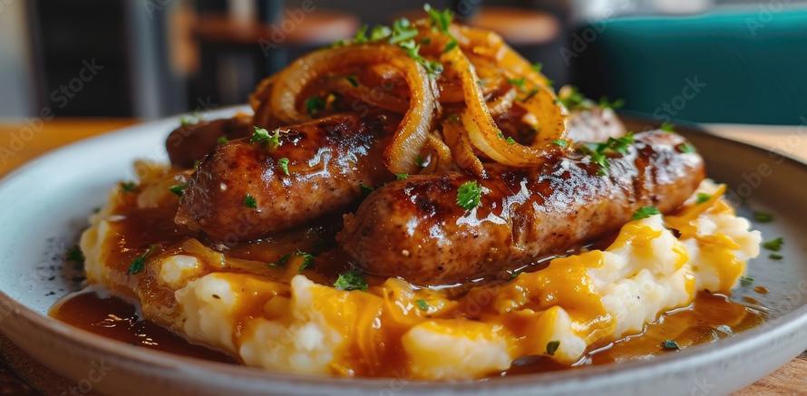 Heat the oven to 200C/Gas mark 6. Heat the oil in an ovenproof frying pan and gently sizzle the sausages over a medium-high heat for 8-10 mins, turning them until browned on all sides. Transfer to a plate, put the butter in the pan, heat until sizzling, scatter in the onions, stirring them into the butter then add the thyme sprig, bay leaf and sugar. Give everything a final stir then put the sausages on top and drizzle over any juices from the plate. Roast everything for 20 mins, turning the sausages halfway through.