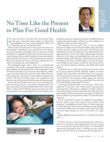 setting the stage for an unpleasant experience. So while whitening is great and certainly makes a difference in one’s confidence, it’s important to take care of first things first! The foundation of your smile is key... it must be healthy! Everyone is unique, so your action plan will be unique. For some, the focus may be on improving the way the teeth occlude (come together) because this can often be the cause of periodontal (bone/ gum foundation) concerns. For others, early periodontal disease (infection in the gums and underlying bone) will need to be addressed. Decay and broken down, old restorations also need to be addressed. For many, a healthy hygiene visit may be all they need. Whatever your scenario, a good start will put you well on your way toward achieving maximum oral health and overall wellness. A quick fix may not always be the right answer. If your teeth are in good condition generally, although crooked, an instant cosmetic smile with crowns and veneers may not do you justice over the long haul. You may want to consider Invisalign®. Within a short period of time, wearing invisible aligners can help you achieve the perfect smile with your natural teeth! Less cost, and less overall lifetime maintenance! Consider it. Learning good dental health at an early age is vital! A fun experience is only part of the whole picture. Learning about good homecare is what leads to a lifetime of healthy smiles! In our family practice, periodic dental health visits help record and track baselines. Homecare instructions provide the coaching you need to establish a good preventive routine. It’s more than just a “cleaning”. Picture yourself this holiday and imagine the possibilities. Send us a photo of your smile or come in for a courtesy “smile evaluation”. Comprehensive doesn’t mean it’ll take a long time! In reality, with the modern dental technologies we make available to you, your healthy smile can emerge sooner than you’d think, and some major changes can occur in the course of a single visit! Happy Holidays from your friends at 11 Friends Lane, Suite 100! LL Dr. Robert Lantzy is a compr ehensive family dentist in N ewtown, Bucks County. He and his caring staff of professionals provide a range of services in a state of the art facility where the focus is on individualized attention and lasting patient-doctor r elationships. you may r each the office at (215) 860-5901 or by visiting www.buckscountydental.com. November | December Local Living