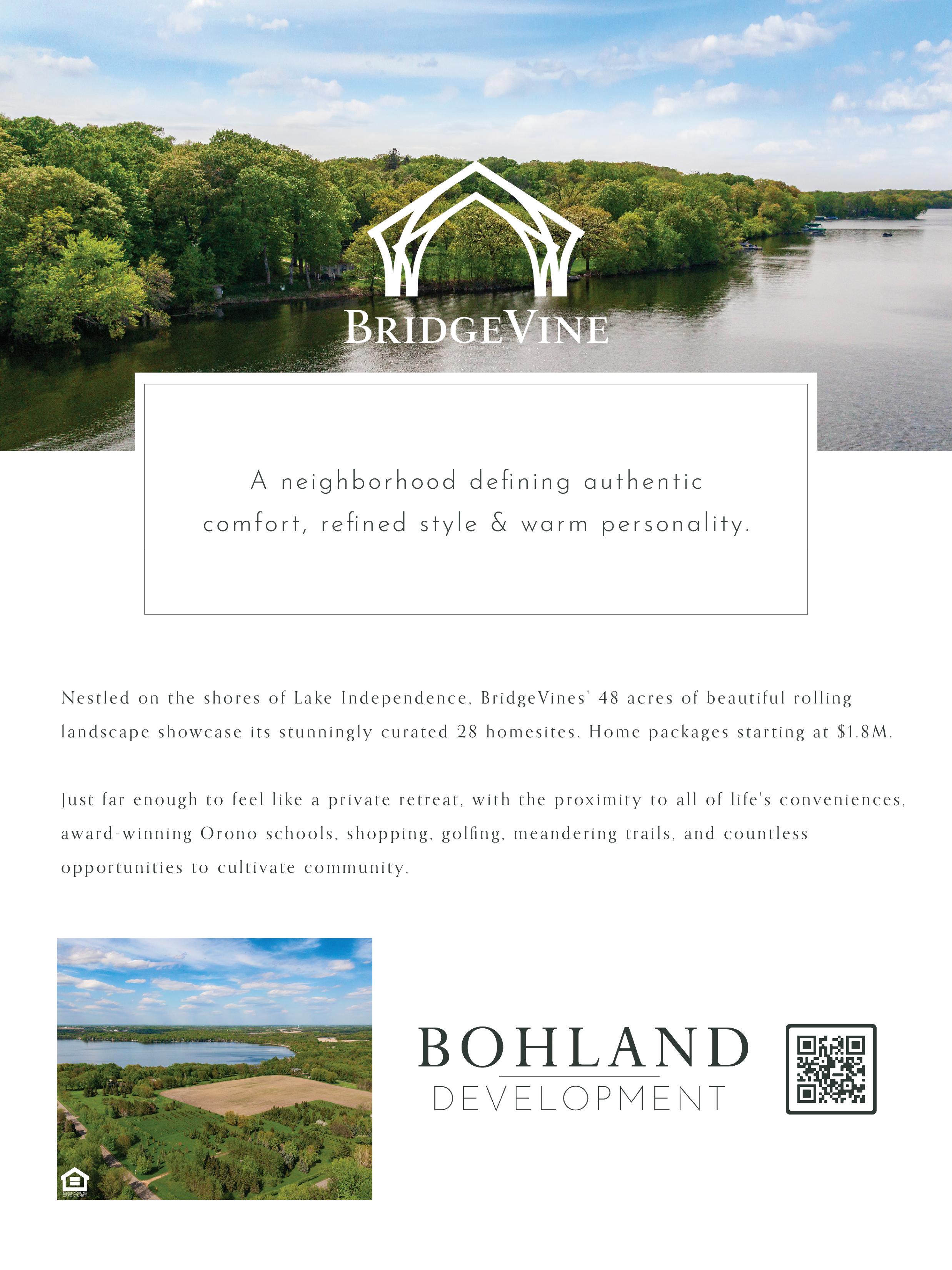M THE EADOWS on hals te ad ’s ba y Nestled along acres of preserved parkland forest, this spectacular neighborhood offers beautiful wooded and wetland views in a serene setting just off Halstead’s Bay in Minnetrista. OUTSTANDING AMENITIES • Private clubhouse, pool, parks & playgrounds • Miles of wooded trails connecting to local & regional trails • 150 acres of permanent & protected open space GREAT LOCATION • Minutes from shopping, recreation & dining • Access to 4,000 acres of surrounding parkland • Easy access to highways 7, 5, 212, & I-494 A beautiful place to call home near the shores of Lake Minnetonka. Josh Meyer | Gonyea Homes, Inc. jmeyer@stonegatebuilders.com | 612-597-5000 Jeff Martineau | Coldwell Banker Realty jmartineau@cbburnet.com | 952-210-2626