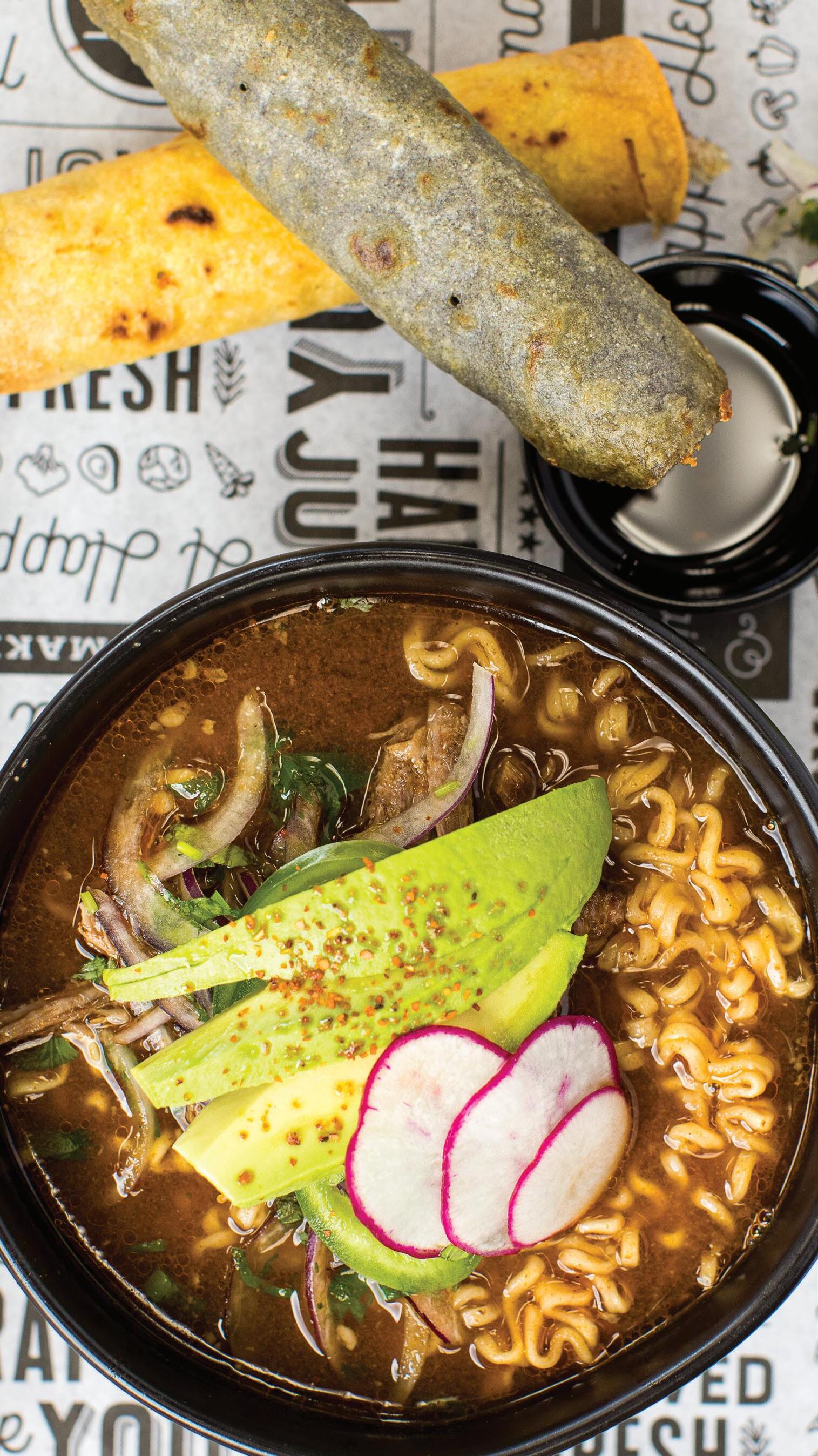 The Birria Ramen features ramen noodles, braised beef, onions, cilantro, jalepeños, raddish and avocado served with braised beef and cheese taquitos.