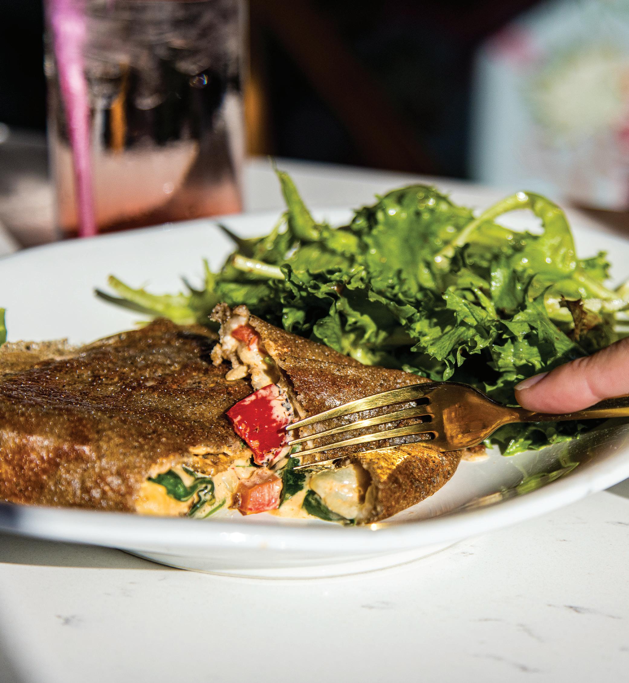 try a slice of its towering crêpe cake. Its flavor often changes, depending on what Corvaisier has on hand. She hadn’t explored crêpe cakes until 2020, when she embraced the time quarantined at home by getting creative in the kitchen. “I had seen the crêpe cakes before. I was hesitant … but for six months, I made a new cake each week, inventing new flavors and posting them on social media for fun,” she says. Celebrated with enthusiasm for their beauty, those 20 some crêpe cakes in 2020 unknowingly paved the way for the menu