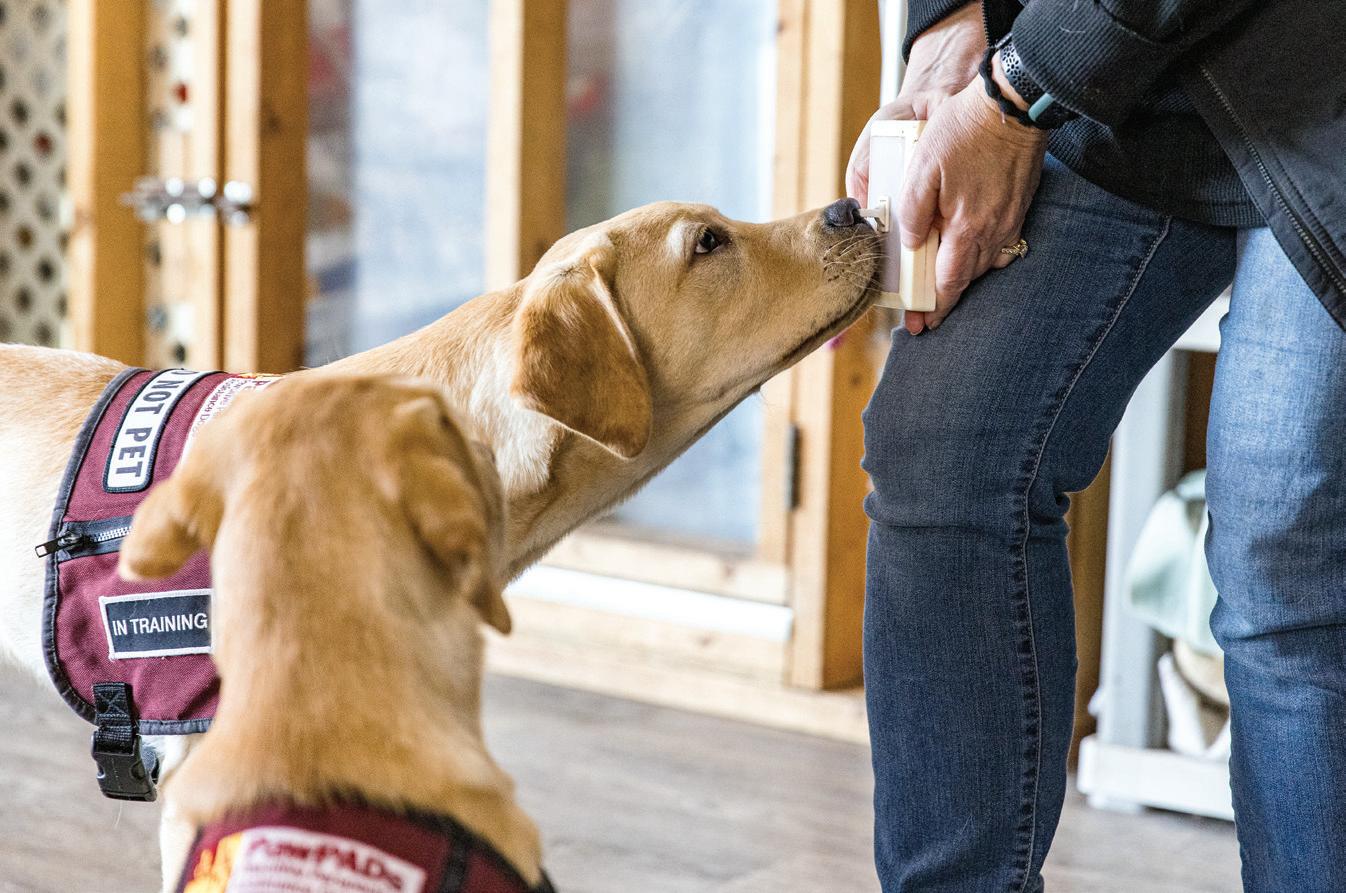 Training begins when dogs are around 8 to 10 weeks old, and they spend about two years with PawPADs staff or those in training programs. As a group of dogs nears the finish line, Ball and her staff review the waitlist to see if any of the dogs have strengths that will be best suited for clients on the list. “What does this client need? And what dogs do we have that might fulfill that need?” Ball says.