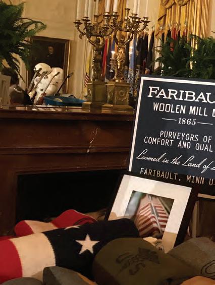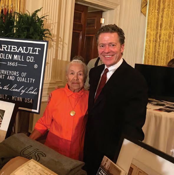 Top right: Mary Boudreau worked for the company as a master weaver for decades. When the White House called to invite Faribault Mill to its Made In America Showcase in 2017, Paul Mooty asked Boudreau to attend. She stands beside former CEO Tom Kileen.