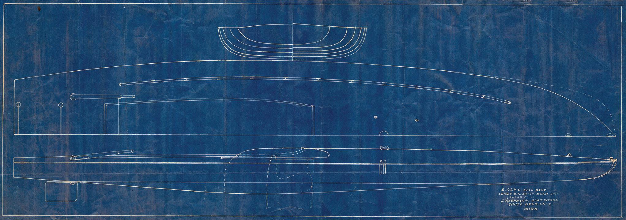 J.O. Johnson came to White Bear Lake from Norway in 1893 to work for Amundson Boat Works. He was 18 years old. Three years later, he left Amundson to pursue plans for a radical new sailboat. His first sailing scow, funded by a local sailor with the White Bear Yacht Club, won its first race in 1897. “This is a historic drawing right here. This is the first design of the [E Scow], and they’re still sailing these today,” Jay Rendall says. “I recovered this. I found it laying on top of a cabinet with a cat laying next to it.”