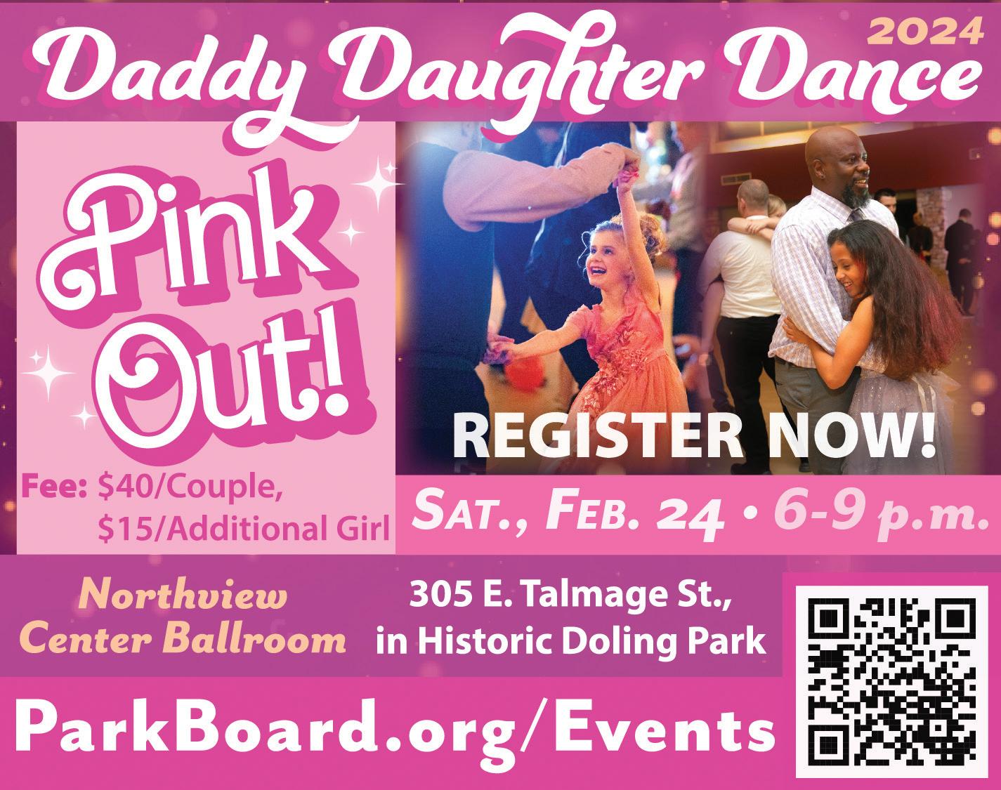Daddy Daughter Dinner & Dance at Northview Center, 6-9 p.m. Ages 3 and older. This year’s theme is “Pink Out.” $40/couple, $10/additional girl. Register early; space is limited. Northview Center, 305 E. Talmage St., Springfield 417-837-5900 or parkboard.org