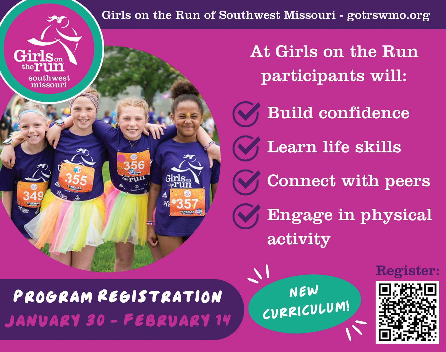 Girls on the Run teaches critical life skills through a research-based program. Trained volunteer coaches inspire team members of all abilities to strengthen their confidence through dynamic, interactive lessons and physical activity. With specially designed program for girls in grades 3-5 and grades 6-8, Girls on the Run supports girls where they are in the normal course of development. At the end of the season, all team members complete a 5K event together. The Girls on the Run curriculum is structured to foster social skills and teamwork. Locations for Girls on the Run Southwest Missouri in Greene and Christian Counties are listed on their website. See ad on page 19.