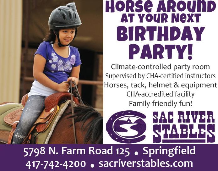 To horse around on your next birthday, trot on over to Sac River Stables. Parties include a climatecontrolled party room along with horses, tack, helmets and other equipment needed for riding in an indoor riding arena. All parties are supervised by CHA-certified instructors at this CHA-accredited facility, using well-trained horses. See ad on page 17.