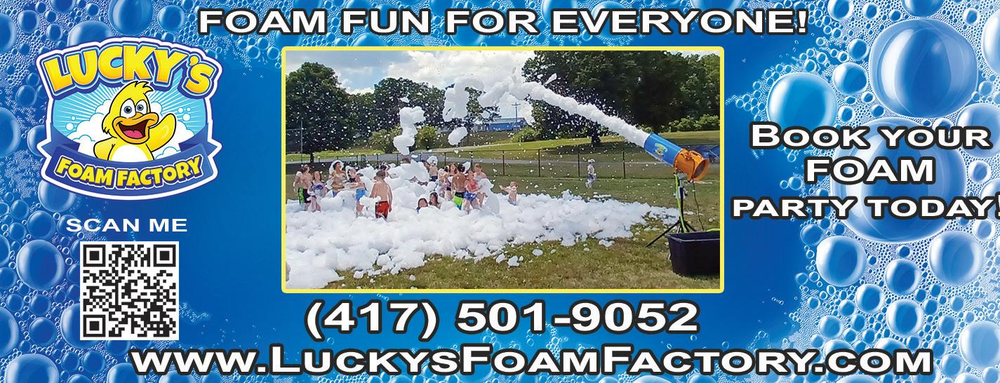 Lucky’s Foam Factory adds a blast of foam fun to your party. Lucky’s offers three packages to choose from for an hour of foam play time. The foam cannon fills a 30’x30’ area in minutes. Want more play time? Add an additional hour for an upcharge. And, don’t worry––clean-up is easy! The foam is hypo-allergenic, safe for your grass, dye-free, biodegradable, and pet-friendly (Even dogs can have foam parties!) Packages include a music sound system, set-up and tear-down, foam-zone safety signs, and a trained staff member. See ad on page 12.