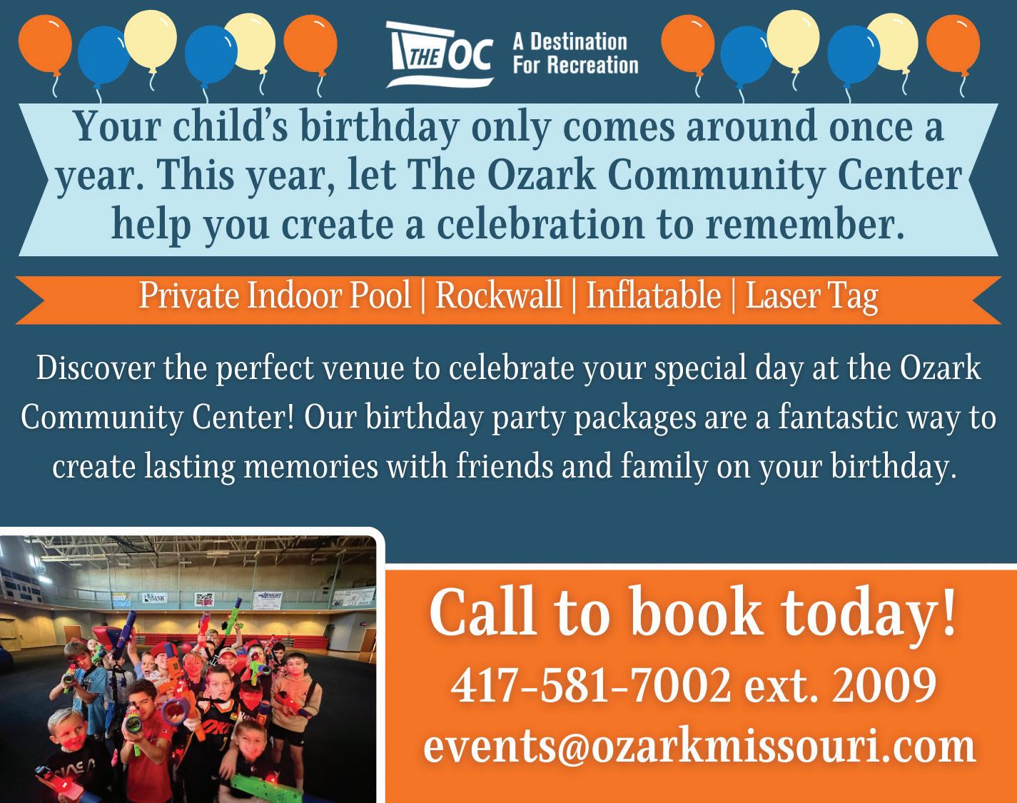 ozarkmissouri.com/224/parties Your child’s birthday comes around once a year. This year, let The OC help you create a celebration to remember. The OC hosts two-hour pool parties in a party room in the aquatics area for up to 20 kids. Playtime includes the indoor pool, slides, and lazy river. Or challenge your birthday kid and guests to a twohour Inflatable Obstacle Course Party. Or, consider a party at the Grubaugh Municipal Outdoor Pool. Find complete party package details online. See ad on page 19.