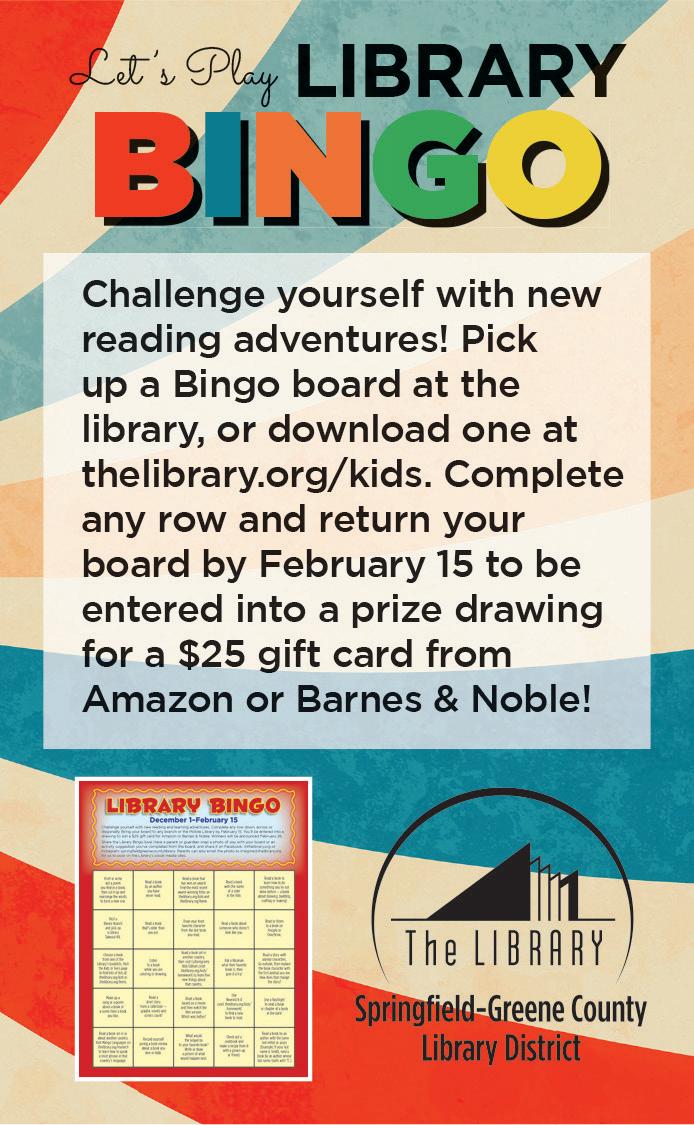 Winter Movie Marathon at The Library Center. Jan. 2: “Spider-Man: Into the Spider-Verse” (PG) at 11 a.m.; “SpiderMan: Across the Spider-Verse” (PG) at 2 p.m. Jan. 3: “Captain Underpants” (PG) at 11 a.m.; “The Bad Guys” (PG) at 2 p.m. 2-3:40 p.m. The Library Center, 4653 S. Campbell Ave., Springfield thelibrary.org See ad on page 4.