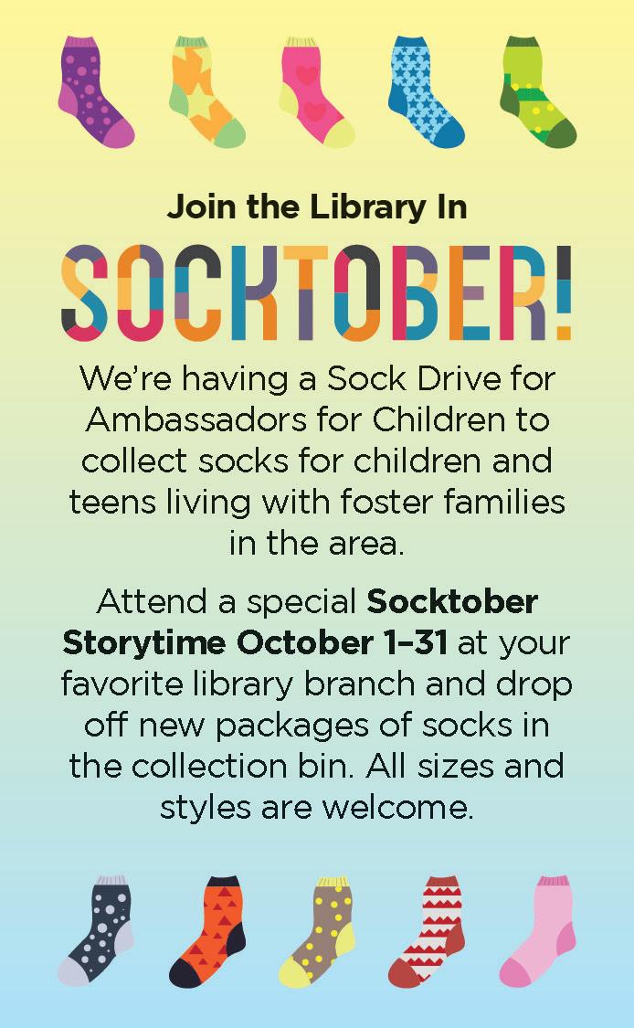Soctober at your Springfield-Greene County Library. Sock drive for children and teens living with foster families. Attend a Socktober Storytime and bring a new package of socks for the collection bin. thelibrary.org See the ad on page 11.