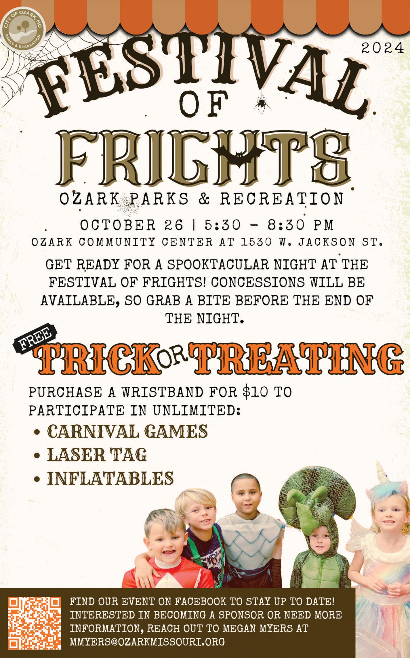 Festival of Frights at The OC, 5:30-8:30 p.m. Trick or treating, carnival games, laser tag, inflatables and s’mores by the fire. The OC, 1530 W. Jackson St., Ozark 417-581-7002 or ozarkmissouri.com See the ad on the back cover.