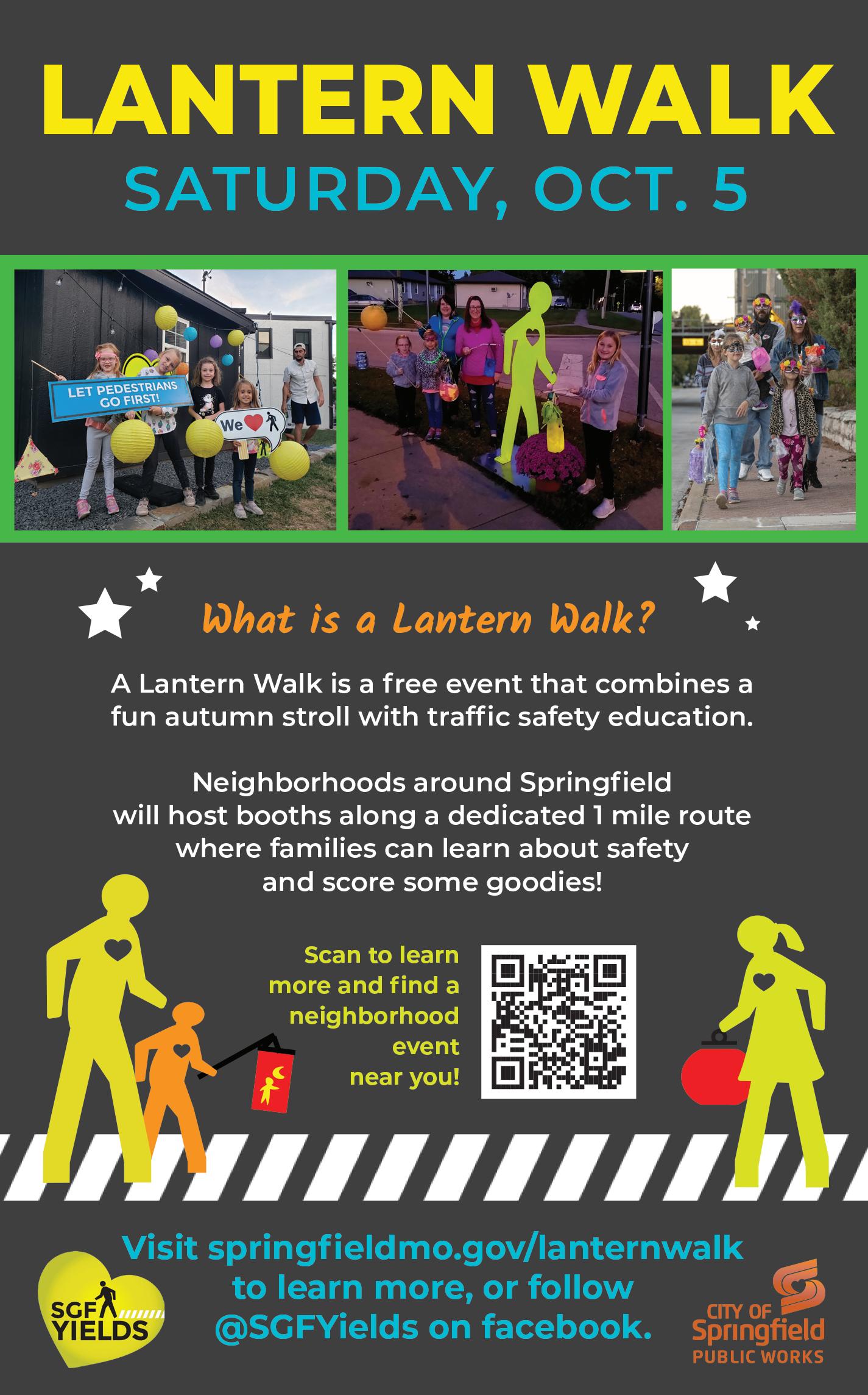 Lantern Walk hosted by the City of Springfield. Free one-mile autumn stroll with traffic safety education. springfieldmo.gov/lanternwalk See the ad on page 13.