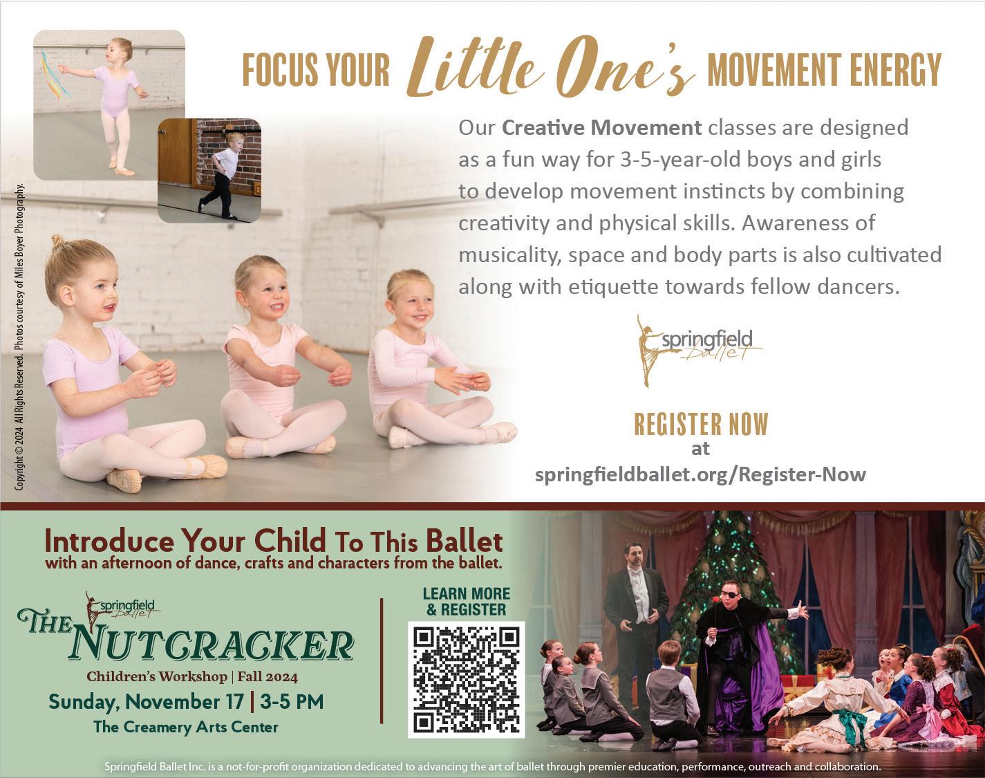 Springfield Ballet transforms the lives of children through dance, instilling confidence and fostering strong character through selfdiscipline. Dance With Me classes being Oct. 2 for 2- and 3-year-old children to develop body awareness, movement, and creativity Creative Movement classes are designed as a fun way for 3- to 6-yearold boys and girls to develop movement instincts by combining creativity and physical skills. The children cultivate an awareness of music, space, and their body movements, along with social skills relating to fellow dancers. The second Fall 2024 8-week session for Creative Movement begins Oct. 15. See the ad on page 20.