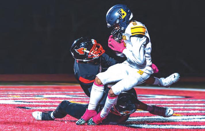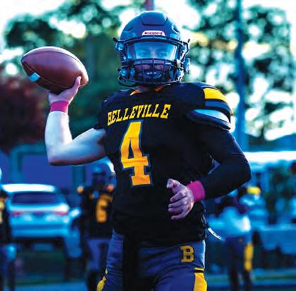 At left, Belleville senior quarterback Jordan Armstrong looks to pass during warmups and, above, senior Jaden Westfield, No. 6, holds the ball in the end zone against a Kearny defender. Additional photos can be found at www.EssexNews Daily.com.