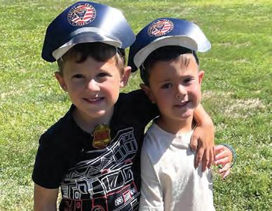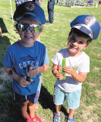 At left, Janissa Rosado, her 2-year-old son Ian and Detective Corey Loforte stand beside Loforte’s police motorcycle at the recent annual Ice Pops with Cops/Cool Down with the Fire Department event at Hillside Avenue School. Above left, Eleanor, 4, and Everett, 7, enjoy free ice pops at the community event. Everett’s favorite part was getting sprayed with the hose. Above right, Brayden, 4, and Nicholas, 4, wear their own police caps at the annual event.