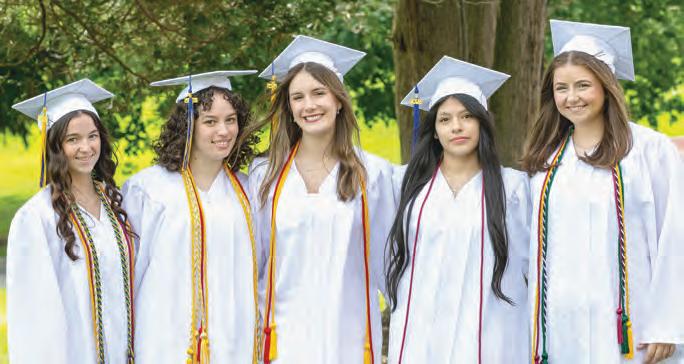 CONGRATULATIONS! — From left, Keira Tagliareni of Bloomfield, Siabella Kenworthy, of Belleville, Gabriella Liloia, of Nutley, Jaritza Sanchez, of Bloomfield, and Regina Salandra of Bloomfield, along with Monet Nicolic, of Belleville, who is not pictured, graduated from Mount St. Dominic Academy on Sunday, June 1. They were among the 61 students to graduate during the school’s 130th Annual Commencement.
