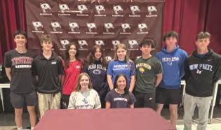 Nutley High School Athletics honored several student-athletes. as they announced their college decisions to continue their athletic careers. Standing, from left, are Shane Castellanos – Erskine College, in South Carolina; volleyball; Gavin Warburton – Thomas More University, in Kentucky; volleyball; Gabriella Botti – Sacred Heart University, in Connecticut; bowling; Alexa McLaughlin – Penn State University at Schuylkill; volleyball; Grace Christie – Mount Saint Mary College, in New York, basketball; Anthony Oramas – Marywood University, in Pennsylvania; soccer; Drew Slomkowski – Seton Hall University, baseball; and Nick Palumbo – State University of New York at New Paltz, baseball. Seated, from left, are Amanda Scaperotta – John Carroll University, in Ohio; volleyball; and Serena Genna – Quinnipiac University, in Connecticut. To see more photos from this event, visit www.EssexNewsDaily.com.