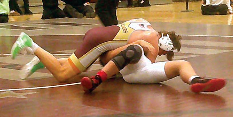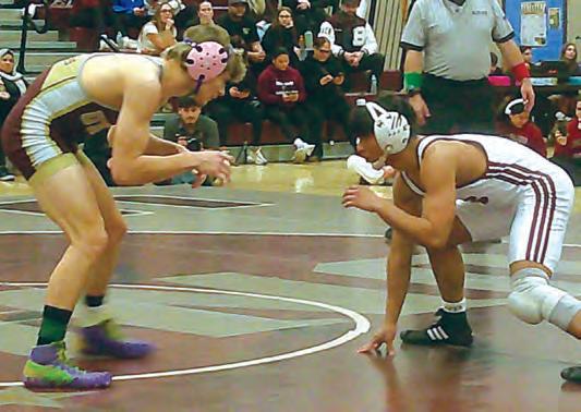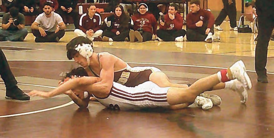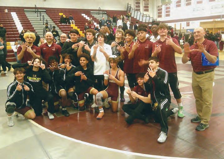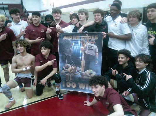 Above, Union High School standout 144-pound senior Aidan Cross won his 100th match on Monday, Feb. 16, at home vs. Bayonne High School. Here, Cross is honored and surrounded by his teammates. Above right, Cross, at left, won by fall in 2:58 at 144 pounds vs. his Bayonne counterpart. At right, Union wrestling head coach Dino DeBellonia, the 2025 and 2026 Union County Coach of the Year, is in his 17th season at the helm of the Farmers. DeBellonia has guided the Farmers to 56 wins the past three seasons. Union was one victory away from a firstever sectional championship.