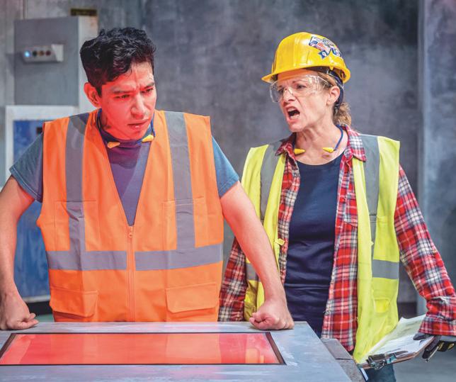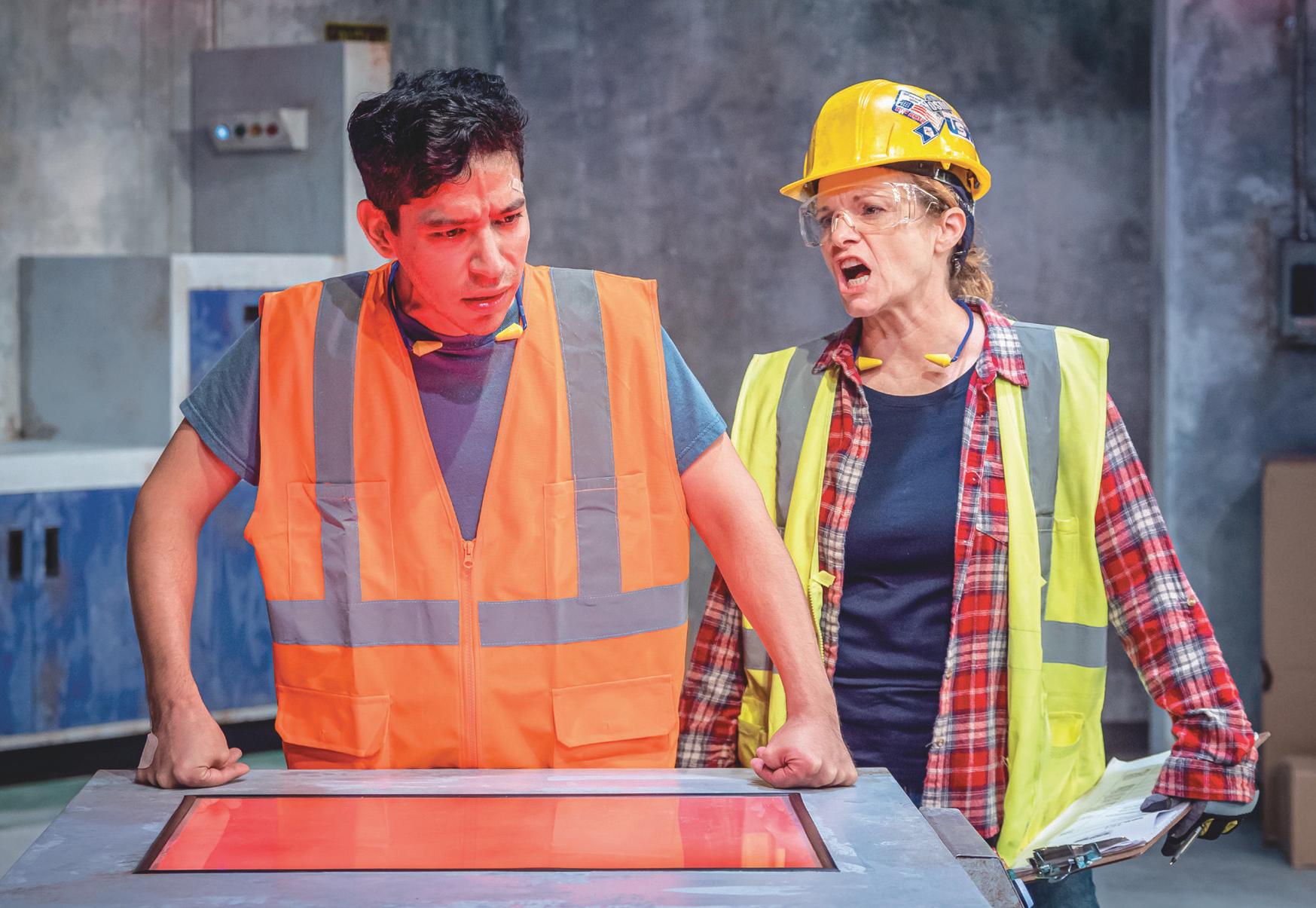 veying tension. The machines are just four rectangular boxes, on an otherwise barren stage, which intermittently come to life with warning lights and alarms, as though demanding to be heard. A realistic lunch room, set above and aside the work area, reinforces the inhumanity of the factory.