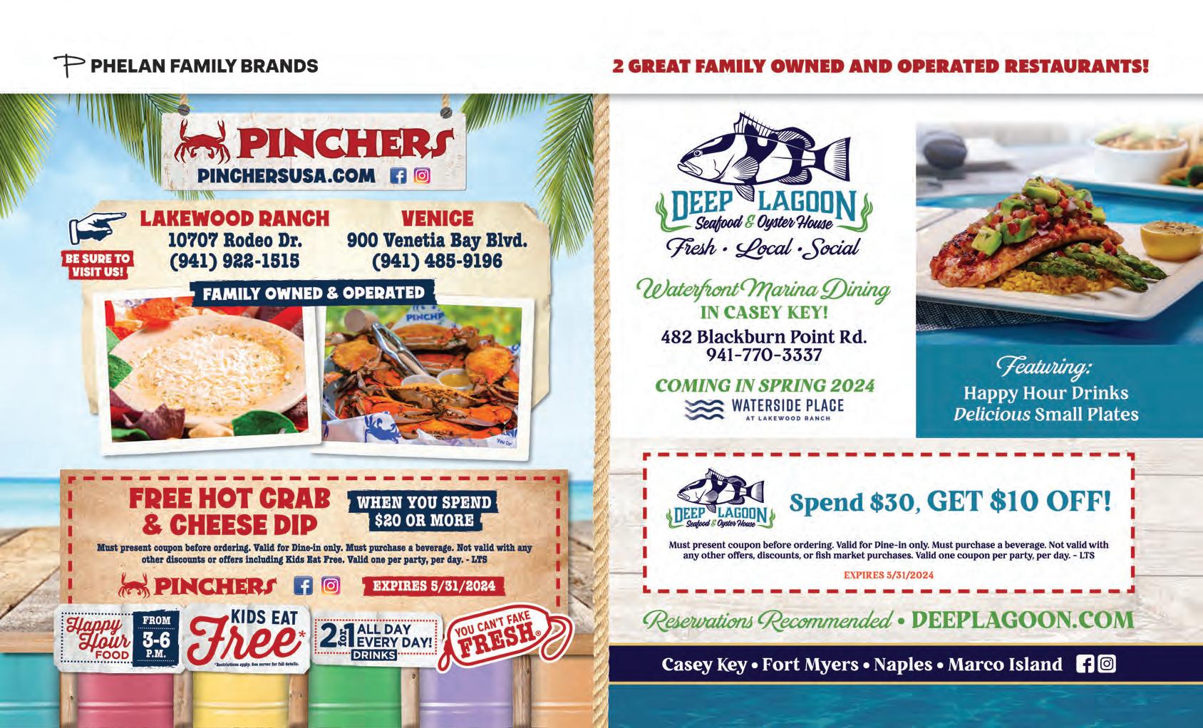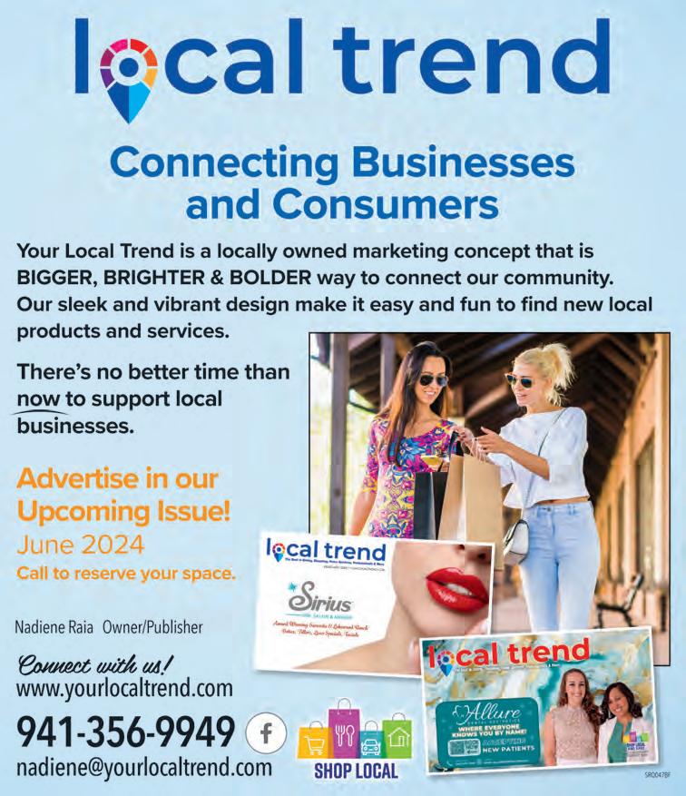 BRADENTON 4734 Cortez Road West (Next to Metro Diner) (941) 909-0800 SARASOTA NORTH 2855 University Parkway (Between Publix & Panera Bread) (941) 556-6400 SARASOTA SOUTH 4055 Clark Road (Expo Center near Moe’s) (941) 927-6200 MIDTOWN 1279 South Tamiami Trail (Between Panera Bread & Michael’s On East) (941) 308-7600 MassageEnvy.com M-F9a-9p|S9a- 8p|Su10a- 6p Mom d erv a timeout. Come in or visit MassageEnvy.com/MothersDay to learn about special Mother’s Day savings! MASSAGE | FACIALS | STRETCH At participating locations only, while supplies last. Each location is an independently owned and operated franchise. ©2024 ME SPE Franchising, LLC. MM#27535, MM#23392, MM#34107, MM#39805 PRSRT STD U.S. POSTAGE PAID SARASOTA, FL PERMIT NO 1406 To Advertise Call or Text 941-356-9949 or email at info@yourlocaltrend.com o MAY 2024 ISSUE 047 SA1