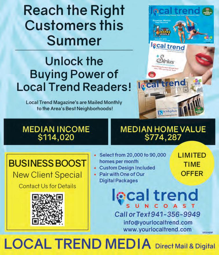 YOU BUILD THE SANDCASTLES, WE’LL CLEAN THE HOUSE. Visit us at MollyMaid.com to learn more. Molly Maid of Sarasota, Manatee, Charlotte Counties Save On Your Cleaning Service Restrictions may apply. Not valid with other coupons or discounts. Must present coupon. Expires 7-10-24 New Customers Only. $50 OFF One Time Cleaning (3 hour minimum) PRSRT STD U.S. POSTAGE PAID SARASOTA, FL PERMIT NO 1406 To Advertise Call or Text 941-356-9949 or email at info@yourlocaltrend.com o JUNE 2024 ISSUE 048 SA2 MOLLY MAID® OF SARASOTA, MANATEE, CHARLOTTE COUNTIES 941-877-0100 Trust the cleaning professionals Affordable Price • 24-Hour Clean Warranty • No Contracts Call For a Free Estimate • Professional Quality ©2019 Molly Maid, LLC. Each franchise is independently owned and operated. Over 500 eviews! HHHHH