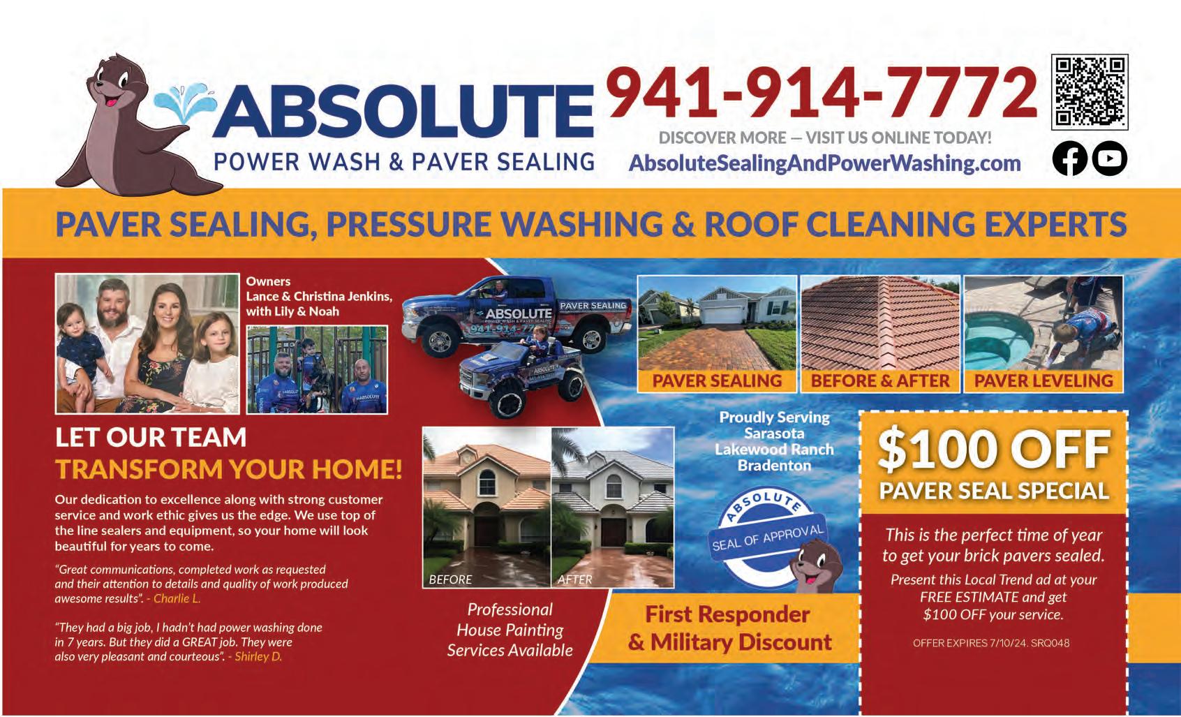 HOOVERPRESSURE.COM • LOCALLY OWNED & OPERATED RESIDENTIAL & COMMERCIAL Serving Southwest Florida Since 1996 Roof & Exterior Cleaning Driveway Cleaning Pool Cage & Deck Cleaning Gutter Clean Out Paver & Concrete Sealing EPA approved stain prevention system Not valid with any other offers or discounts. Restrictions may apply. Coupon must me mentioned at booking. Must present coupon. Expires 7-15-24 Regular Priced Pressure Cleaning Services *Discount does not apply to Roof-A-Cide or Sealing Services 10% OFF AFTER BEFORE AFTER BEFORE RESIDENTIAL • COMMERCIAL NEW CONSTRUCTION • MAINTENANCE CONTRACTS Sales • Installation 344 Center Ct., Venice 34285 Check out our website at performanceairvenice.com • Air Conditioning & Heating • Service & Repairs of all Makes & Models • Pool Heat Pumps • Commercial Refrigeration 941-497-7007 Mecha ni c al Co ntr act o r Lic #C M C124972 3 24 HOUR EMERGENCY RESPONSE Free Replacement Estimates 18 MONTHS FINANCING SAME AS CASH ON NEW AC UNITS OR AC REPAIRS WITH APPROVED CREDIT Limit one per customer. Must present this coupon. Expires 6-30-2024. $83 Maintenance Special Limit one per customer. Must present this coupon. FREE 10 Year Parts & 5 Year Labor on Specified Units FREE UV Light on installation of a new Air Conditioner or Heat Pump System Limit one per system.