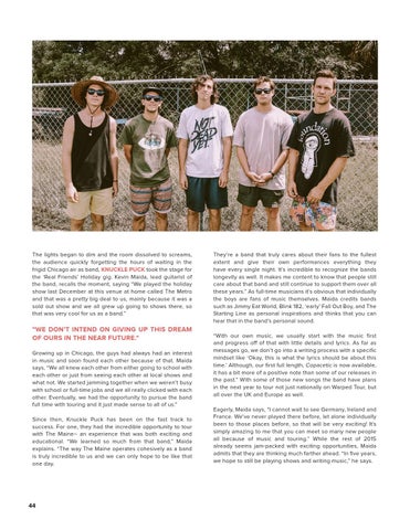 The lights began to dim and the room dissolved to screams, the audience quickly forgetting the hours of waiting in the frigid Chicago air as band, Knuckle Puck took the stage for the ‘Real Friends’ Holiday gig. Kevin Maida, lead guitarist of the band, recalls the moment, saying “We played the holiday show last December at this venue at home called The Metro and that was a pretty big deal to us, mainly because it was a sold out show and we all grew up going to shows there, so that was very cool for us as a band.”
