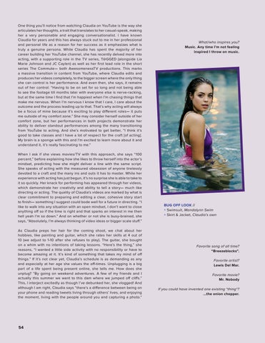 One thing you’ll notice from watching Claudia on YouTube is the way she articulates her thoughts, a trait that translates to her casual-speak, making her a very personable and engaging conversationalist. I have known Claudia for years and this has always stuck out to me in her professional and personal life as a reason for her success as it emphasizes what is truly a genuine persona. While Claudia has spent the majority of her career building her YouTube channel, she has recently delved more into acting, with a supporting role in the TV series, T@GGED (alongside Lia Marie Johnson and JC Caylen) as well as her first lead role in the short series The Commute— both AwesomenessTV productions. This marks a massive transition in content from YouTube, where Claudia edits and produces her videos completely, to the bigger screen where the only thing she can control is her performance. And even then, she says, it remains out of her control: “Having to be on set for so long and not being able to see the footage till months later with everyone else is nerve-racking, but at the same time I find that I’m happiest when I’m chasing things that make me nervous. When I’m nervous I know that I care, I care about the outcome and the process leading up to that. That’s why acting will always be a focus of mine because it’s exciting to play different roles— it puts me outside of my comfort zone.” She may consider herself outside of her comfort zone, but her performances in both projects demonstrate her ability to deliver standout performances among the many transitioning from YouTube to acting. And she’s motivated to get better, “I think it’s good to take classes and I have a lot of respect for the craft [of acting]. My brain is a sponge with this and I’m excited to learn more about it and understand it, it’s really fascinating to me.” When I ask if she views movies/TV with this approach, she says “100 percent,” before explaining how she likes to throw herself into the actor’s mindset, predicting how she might deliver a line with the same script. She speaks of acting with the measured obsession of anyone tirelessly devoted to a craft and the many ins and outs it has to master. While her experience with acting has just begun, it’s no surprise she is able to take to it so quickly. Her knack for performing has appeared through her videos, which demonstrate her creativity and ability to tell a story— much like directing or acting. The quality of Claudia’s videos are marked by what is clear commitment to preparing and editing a clear, cohesive story start to finish— something I suggest could bode well for a future in directing. “I like to walk into any situation with an open mindset, I don’t want to close anything off so if the time is right and that sparks an interest in me then hell yeah I’m so down.” And on whether or not she is busy-brained, she says, “Absolutely, I’m always thinking of video ideas or bigger scale stuff.” As Claudia preps her hair for the coming shoot, we chat about her hobbies, like painting and guitar, which she rates her skills at 4 out of 10 (we adjust to 1-10 after she refuses to play). The guitar, she bought on a whim with no intentions of taking lessons. “Here’s the thing,” she reasons, “I wanted a little side activity with no responsibility or have to become amazing at it. It’s kind of something that takes my mind of off things.” If it’s not clear yet, Claudia’s schedule is as demanding as any and especially at her age she values the off-times. Unplugging is a big part of a life spent being present online, she tells me. How does she unplug? “By going on weekend adventures. A few of my friends and I actually this summer we went to this dam where we jumped off cliffs.” This, I interject excitedly as though I’ve debunked her, she vlogged! And although I am right, Claudia says “there’s a difference between being on your phone and reading tweets living through others’ lives, and enjoying the moment, living with the people around you and capturing a photo.”