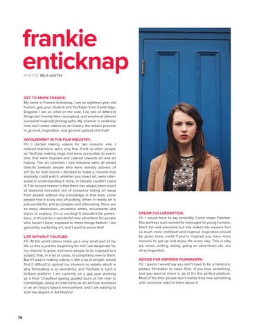 GET TO KNOW FRANKIE: My name is Frankie Enticknap, I am an eighteen year old human, gap year student and YouTuber from Cambridge, England. I am an artist on the side, I do lots of different things but I mainly take conceptual, and emotional (almost surrealist inspired) photographs. My channel is relatively new, but I make videos on art history, the artistic process in general, inspiration, and general upbeat chit chat! INVOLVEMENT IN THE FILM INDUSTRY: FE: I started making videos for two reasons: one, I noticed that there were very few, if not no other people on YouTube making vlogs that were accessible to everyone, that were inspired and catered towards art and art history. The art channels I had followed were all aimed directly towards people who were already adorers of art! So for that reason I decided to make a channel that anybody could watch, whether you loved art, were interested in understanding it more, or literally couldn’t stand it! The second reason is that there has always been a sort of diamond incrusted veil of presence hiding art away from people without any knowledge in that area, some people find it scary and off putting. When in reality art is just wonderful, and so complex and interesting, there are so many dimensions, countless artists, movements and styles to explore, it’s so exciting! It shouldn’t be pretentious, it should be a wonderful new adventure for people who haven’t been exposed to these things before! I am genuinely excited by art, and I want to share that! LIFE WITHOUT YOUTUBE: FE: At this point videos make up a very small part of my life so this is just the beginning for me! I am desperate for my channel to grow, and more people to be exposed to a subject that, in a lot of cases, is completely new to them. But if I wasn’t making videos, I, like a lot of people, would find it difficult to spread my interests so widely which is why filmmaking is so wonderful, and YouTube is such a brilliant platform. I am currently on a gap year working as a Punt Chauffeur (giving guided tours of the river in Cambridge), doing an internship as an Archive Assistant in an art history based environment, and I am waiting to start my degree in Art History!