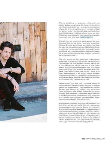 There’s something inexpressibly exhilarating and satisfying about being in a car full of your friends, driving with the windows down, and a long road stretched ahead of you. We all know road trips aren’t complete without the perfect tunes — something to bop your head along to while soaking up the beauty of being young and alive. The perfect band to jam to in these types of unforgettable moments is none other than CHASE ATLANTIC. With all three on vocals and guitar, as well as some individual flair on the drums, bass, and saxophone, Christian Anthony, Mitchel Cave, and Clinton Cave make for quite the talented trio. And yes, Mitchel and Clinton are brothers. The two said they both share a very similar mind frame when it comes to making music which makes for an easy process, although they do admit, “we annoy each other all the time!” The boys stated that they have been making music collectively for a few years, but around the beginning of 2014 decided that they wanted to become a band with a more defined and unique style. This is how ‘Chase Atlantic’ was born. Being an Australian band in the Indian and Pacific Ocean, you might be wondering where the name Chase Atlantic came from. In short, there is no direct meaning behind it. “We thought it would be better to associate the music to a name which had no meaning so that when people heard the name they would associate it to the music only.” Definitely a cool idea. Chase Atlantic says they have “a massive amount of musical influence taken from a vast multitude of different genres and styles of music.” They are especially inspired by music from the 60’s, 70’s, and 80’s, and “live to build upon those ideas with modern techniques and sound choices.” A big name they’d love to work with in the future is The Neighbourhood, solely because they appreciate their “forward thinking sound” and demonstrate all the elements Chase Atlantic loves about music. In songwriting, melodies and lyrics are sometimes like the chicken and the egg— which came first? Being a very production based band, Christian, Mitchel, and Clinton like to build their songs from the bottom up. They create a full instrumental before adding vocals for the top line. There’s nothing like music with a rad beat and lyrics that are real and relatable, and this combination is exactly what Chase Atlantic likes to put out. Nearly all of their songs are based on real life experiences. Their song “Roxanne” is actually about a girl named Roxanne that the boys knew.