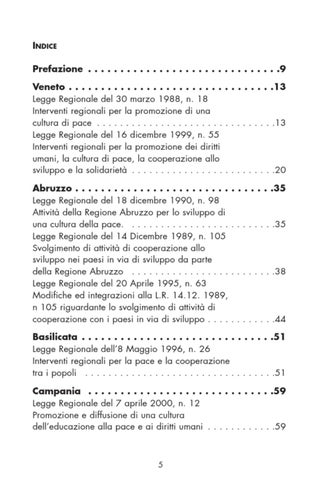 INDICE Prefazione . . . . . . . . . . . . . . . . . . . . . . . . . . . . . .9 Veneto . . . . . . . . . . . . . . . . . . . . . . . . . . . . . . . .13 Legge Regionale del 30 marzo 1988, n. 18 Interventi regionali per la promozione di una cultura di pace . . . . . . . . . . . . . . . . . . . . . . . . . . . . . . .13 Legge Regionale del 16 dicembre 1999, n. 55 Interventi regionali per la promozione dei diritti umani, la cultura di pace, la cooperazione allo sviluppo e la solidarietà . . . . . . . . . . . . . . . . . . . . . . . . .20 Abruzzo . . . . . . . . . . . . . . . . . . . . . . . . Legge Regionale del 18 dicembre 1990, n. 98 Attività della Regione Abruzzo per lo sviluppo di una cultura della pace. . . . . . . . . . . . . . . . . . Legge Regionale del 14 Dicembre 1989, n. 105 Svolgimento di attività di cooperazione allo sviluppo nei paesi in via di sviluppo da parte della Regione Abruzzo . . . . . . . . . . . . . . . . . Legge Regionale del 20 Aprile 1995, n. 63 Modifiche ed integrazioni alla L.R. 14.12. 1989, n 105 riguardante lo svolgimento di attività di cooperazione con i paesi in via di sviluppo . . . .