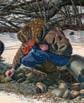 Tyson Grumm's paintings invite us into a nostalgic world of imaginative subject matter, where a world between the past and the future can be derived from characters located within fantastic surroundings. Grumm fuses historical references, quirky animals and misty landscapes to develop a folkloric approach to the figurative tradition. Grumm reveals a story that is only partially told, enabling each viewer to contribute his or her own imagined view towards the interpretation of each work. In his art, Grumm creates whimsical and surrealistic stages by using text within multifarious scenes.