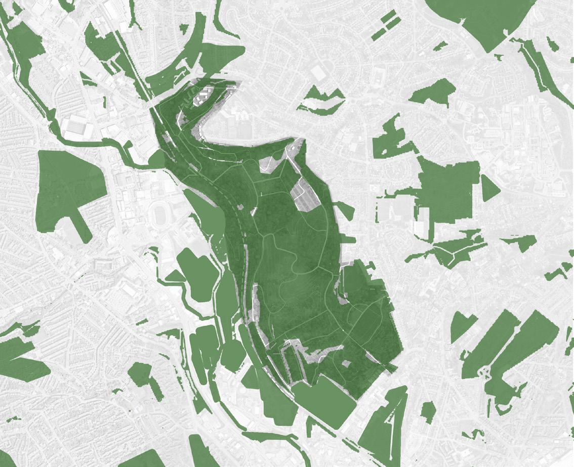 The large-scale mapping represents the connection between the site and the city. It shows the city's transport network system and main rivers, and also shows the green infrastructure, and the population density.