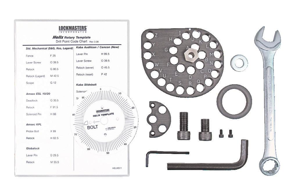A compact aluminum template that revolutionizes the way safe technicians drill containers by attaching to the existing dial ring screw holes and rotating to provide an infinite number of precision drill points. We’re all familiar with the practice of “code cutting” keys. Now the HELIX Revolver pioneers the art of “code drilling” safe locks. The included code card provides an extensive list of drill point codes for practically every modern safe lock. Part