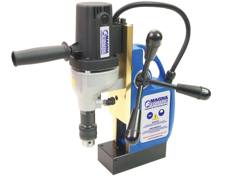 Lockmasters Magna-Bore is loaded with features and ready to work for you. It has a 1200 watt motor, 2200 lbs electromagnetic force, 5-1/2" vertical travel, weighs 23 lbs, includes hard case, 1 year parts and labor warranty. The vertical travel is closer to 5-1/2", but you can still load a 6" bit for drilling. Supplied with 1/2" chuck.