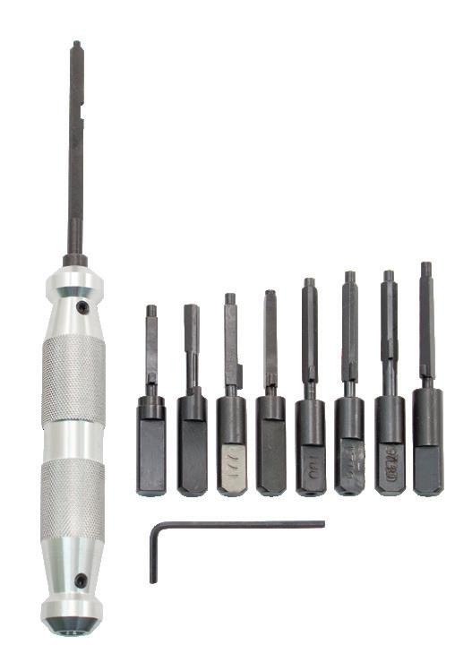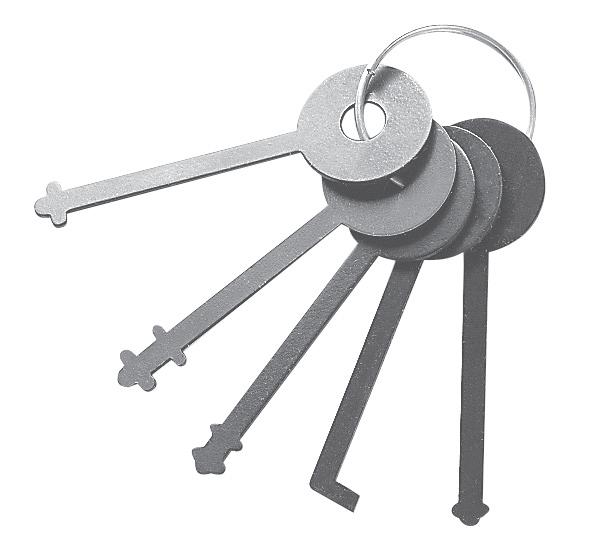 The change keys fit snugly into the anodized aluminum handle and can easily be interchanged. Kit includes one handle (LKM3100), and one of each of these change keys; S&G change key 3 wheel 6730, S&G change key 4 wheel 6721, Mosler 120 change key, Mosler 302 change key, Mosler 1830 change key, LaGard 2050 change key, Diebold 18055 Tri-bolt change key, and Diebold 3 wheel change key. Part Number: LKM3100SET