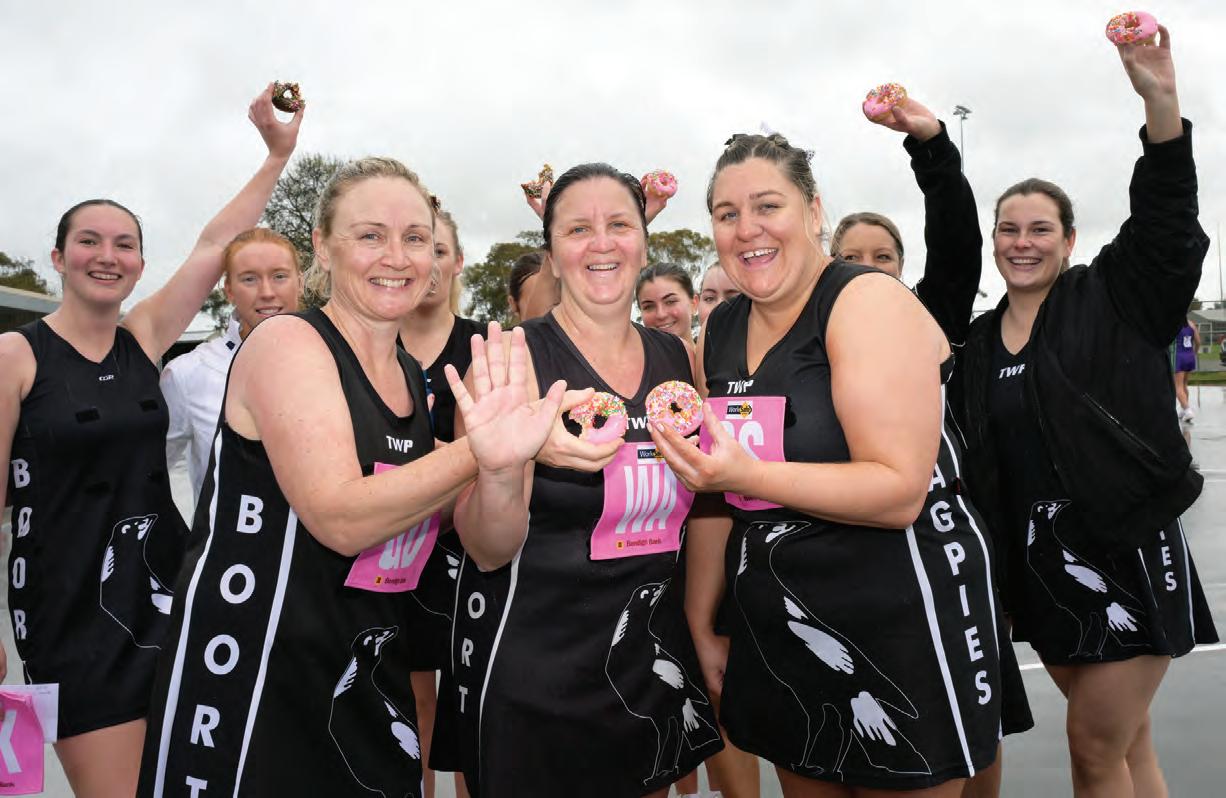 Netball secretary Kath Lanyon, Kristen and Brooke are pictured in “500” donut mode as the team salutes their game record holder.