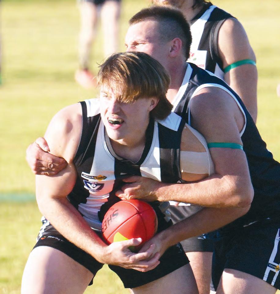 Ruckman Lachlan Sidebottom (back) didn’t play the second half on Saturday, while midfield trio Steve Gunther, Brodie Carroll and Seb Relouw are travelling overseas and won’t return in time for the club’s key games against fellow top-five teams Bridgewater, BL-Serpentine and Inglewood.