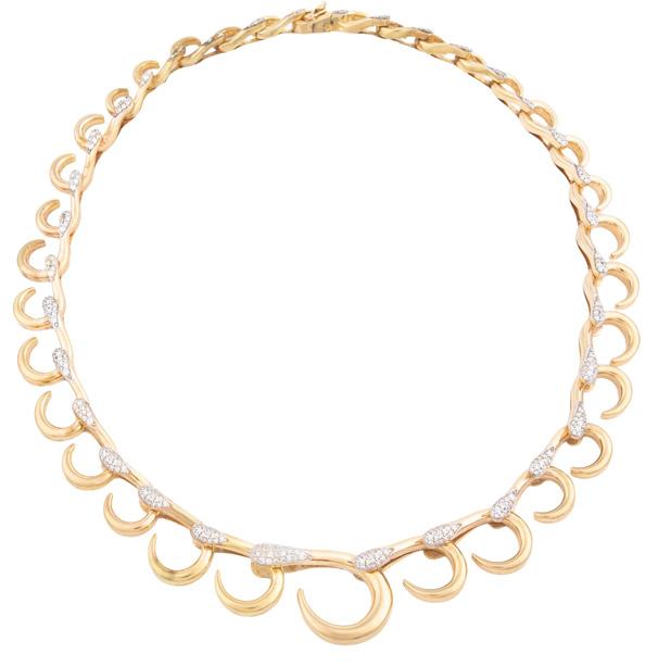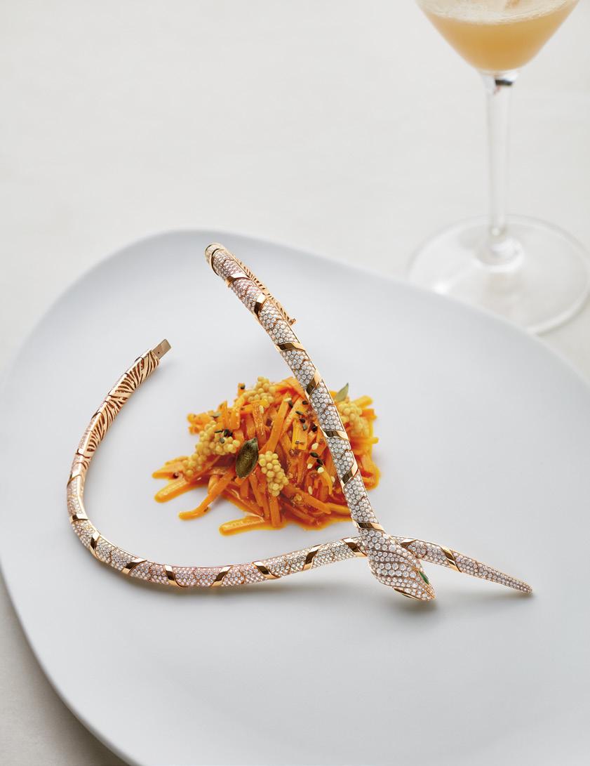 The BVLGARI Serpenti necklace in rosegold diamond pavé wraps the neckline with unapologetic glamour — a serpent of pure brilliance. Paired with Yazid Ichemrahen’s spiced-sweet carrot creation, it becomes a study in decadent contrasts.