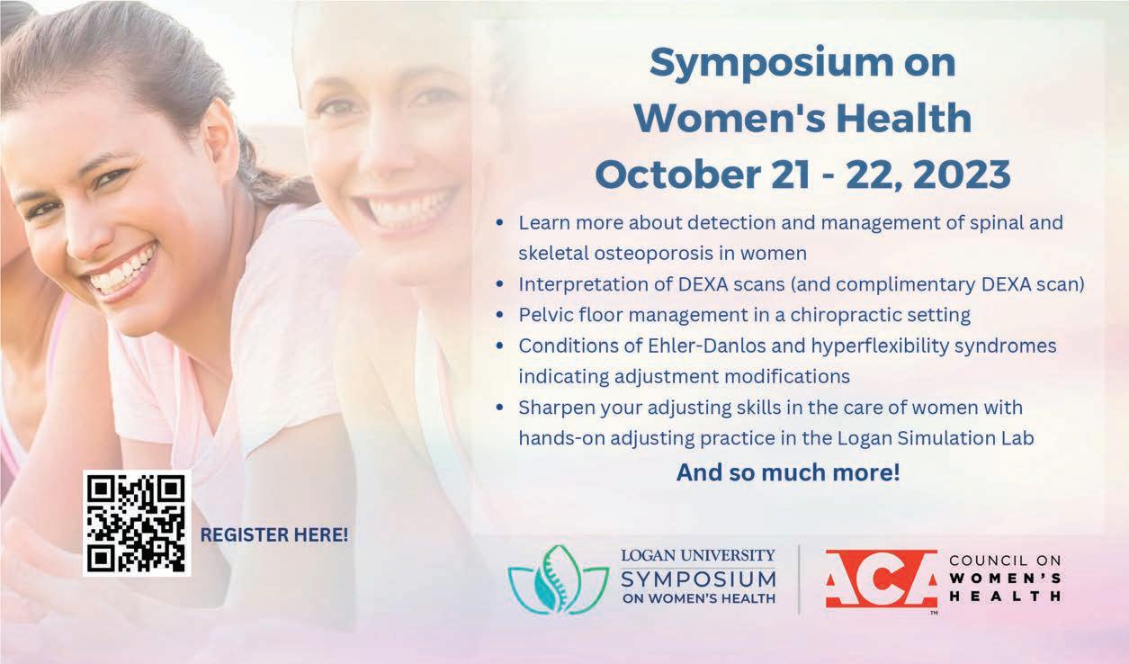 Hosting our annual Symposium is yet another way Logan remains at the forefront of health care education. At this year’s event, which took place April 13-16 at St. Louis Union Station, nearly 600 attendees enjoyed continuing education opportunities, chiropractic exhibitors, networking events and more. Turn to page 26 for a recap and save the date for Symposium 2024 April 12-13!