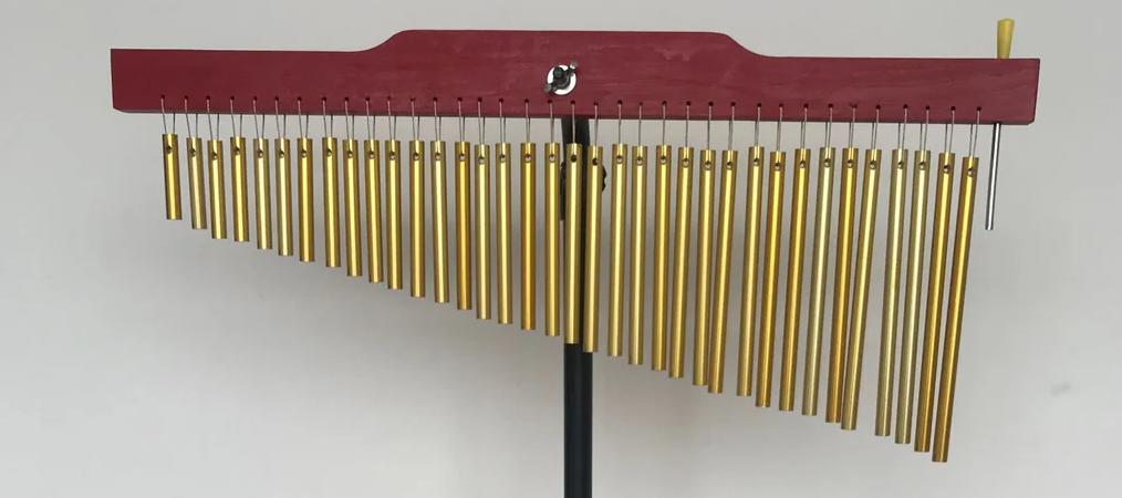 This is for Percussion 4 with regards to a technique for the Wind Chimes. The wind chimes are to be divided into four even sections and are written like quad toms. Hit the sections as illustrated in the picture below with any beater. The purpose is to create a wash of harmonic sound that moves up and down in pitch. Let the wind chimes continue to ring after each hit until the word “choke” appears.