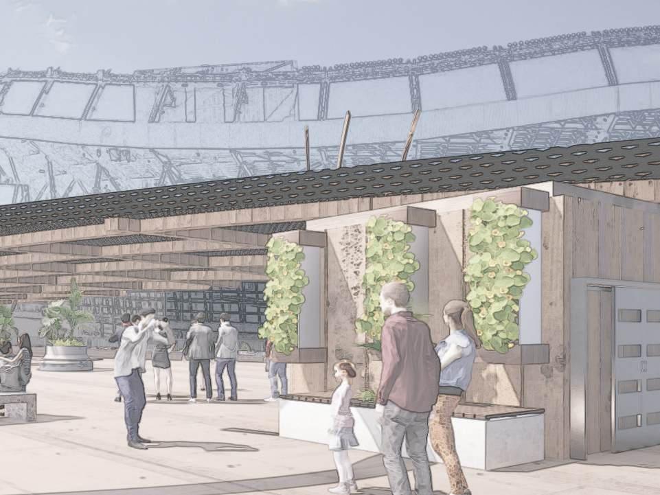 After picking a location directly next to Empower Field, Denver’s biggest stadium, I immediately developed a shape on axes determined by local circulation and neighboring local businesses. The resultant shape pushes people to the surrounding local businesses. The building also houses bays for local businesses to sell food, merchandise, or otherwise, and point people to their permanent locations.
