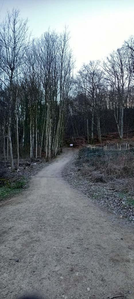 The path follows a biker lane, eventually leading to a magnificent pit, filled with trees.