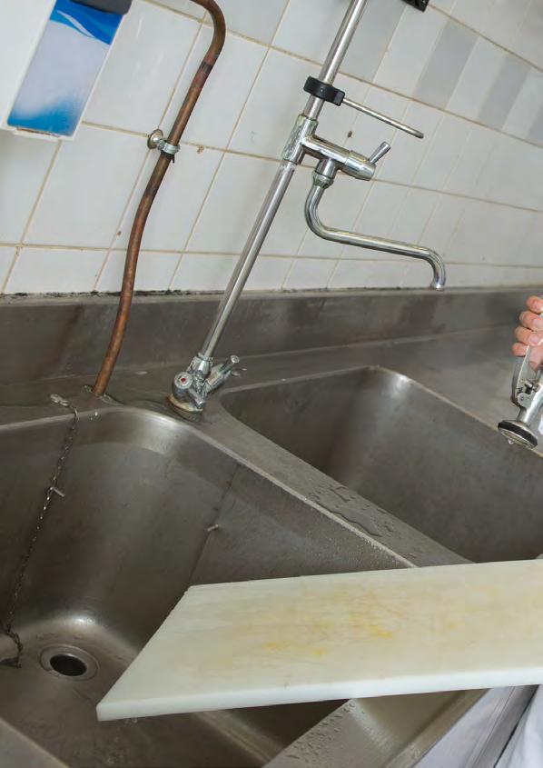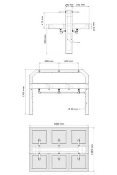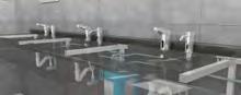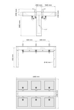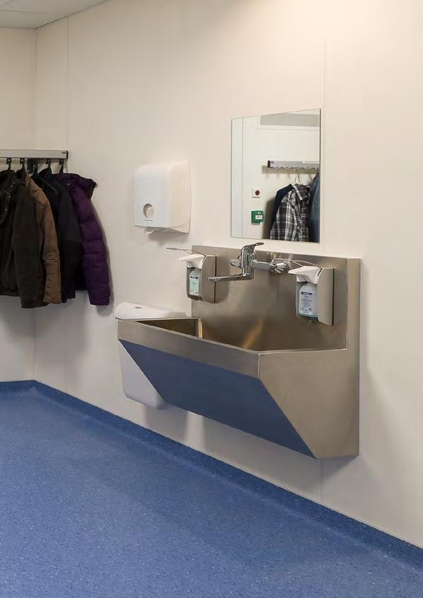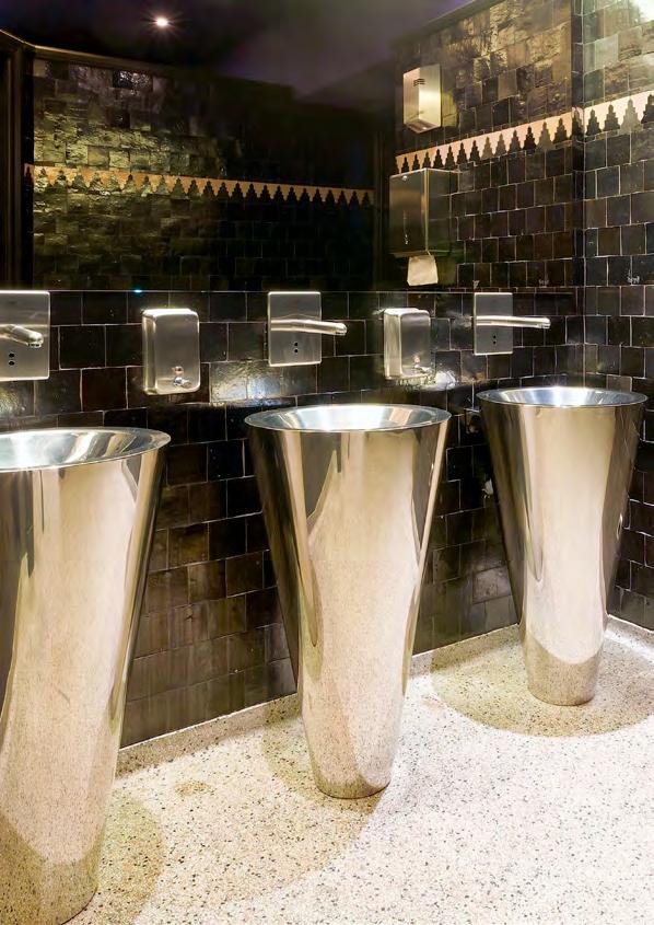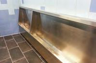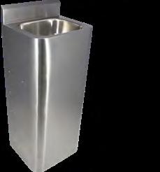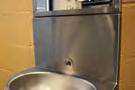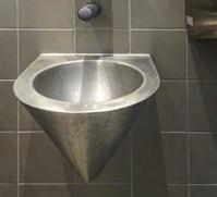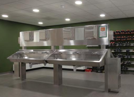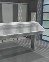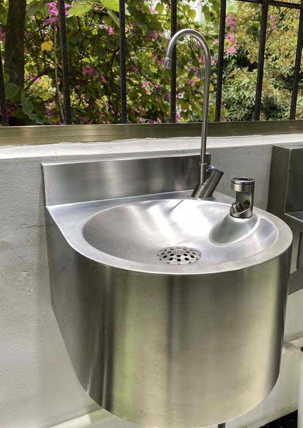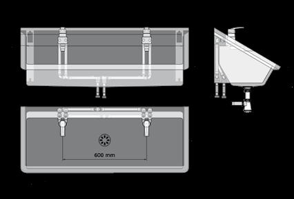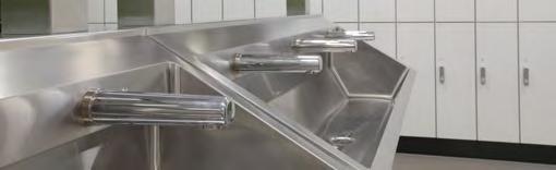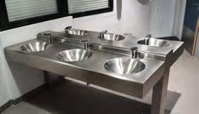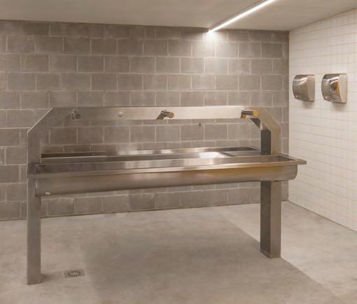 Un choix a été fait pour des lavabos multipostes en acier inoxydable sur pied équipés en robinetterie électronique.