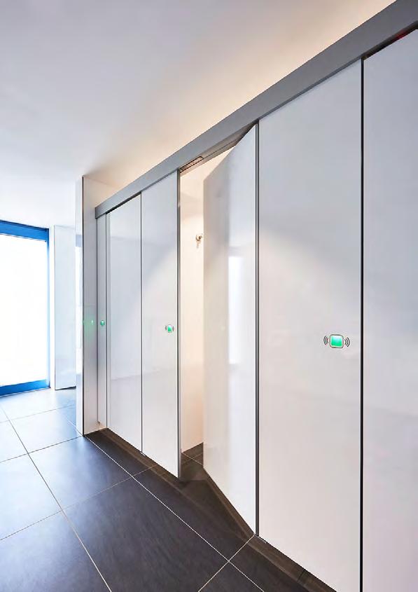 Nous allons même plus loin et pouvons également fournir des cabines sanitaires avec des portes dont l'ouverture et la fermeture se font sans contact. Cela vous donne la possibilité de rendre vos toilettes 100% sans contact pour la première fois (voir aussi notre système "Look & Wave").